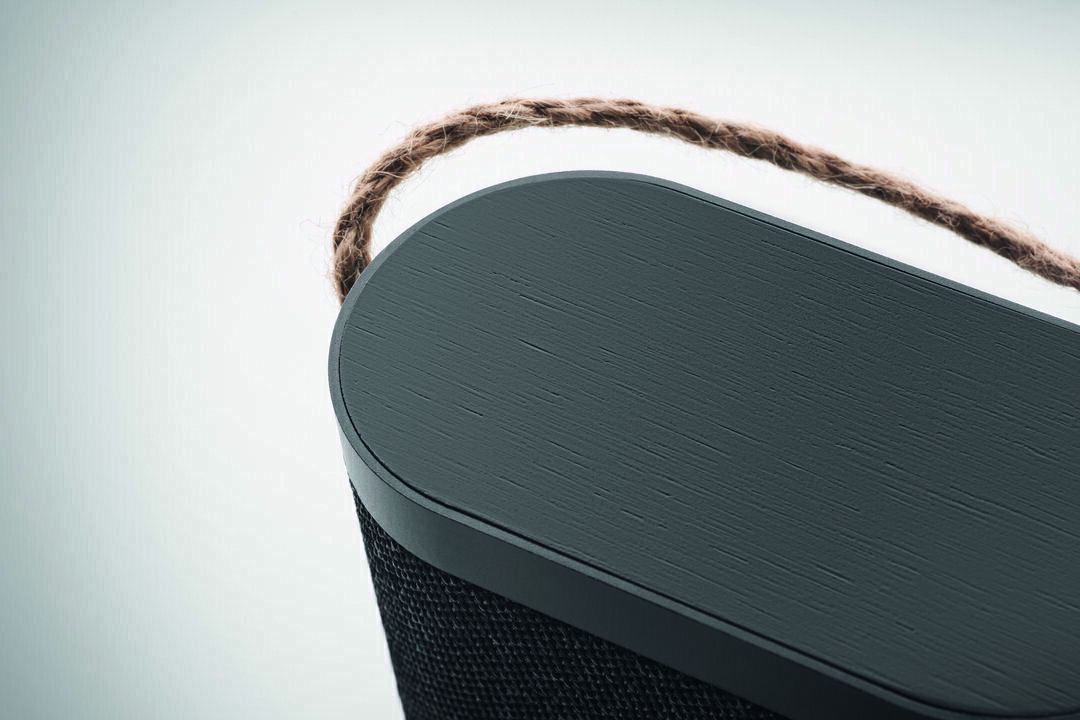 Bluetooth kõlar 5 W ühendab RPET-kanga, bambusest juhtmevaba laadija ja juterihma ning sellel on 1200 mAh aku.