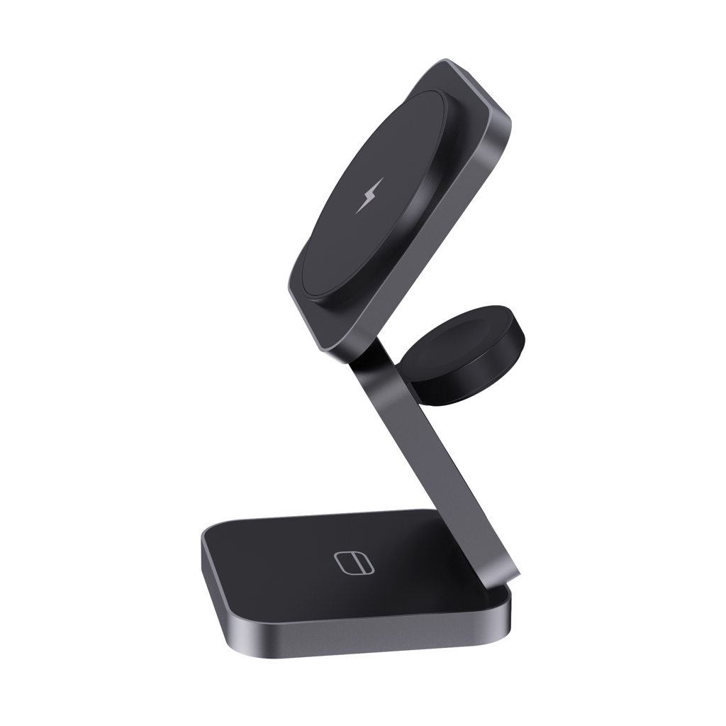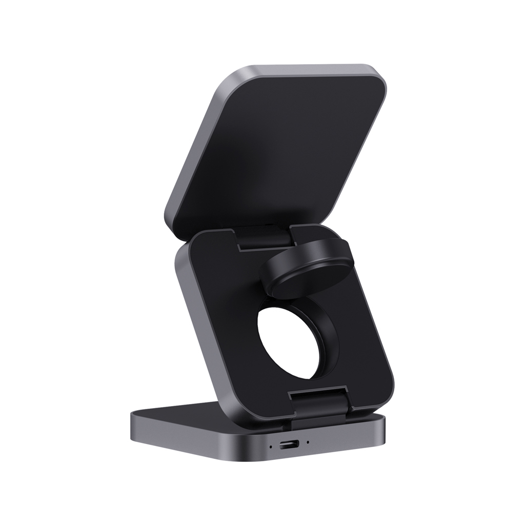 Luksuslik ja kokkupandav kolm-ühes juhtmevaba laadija, valmistatud RCS-sertifikaadiga taaskasutatud ABS-ist ja alumiiniumist, mille taaskasutatud materjal moodustab 46% eseme kogukaalust. RCS-sertifikaat tagab taaskasutatud materjalide täielikult sertifitseeritud tarneahela. Laadija sisaldab magnetilist 15W juhtmevaba laadijat, 5W juhtmevaba laadijat väiksemate seadmete, näiteks kõrvaklappide jaoks, ning 2,5W juhtmevaba laadijat nutikelladele (ainult Apple’i kellad). Toode ja tarvikud on 100% PVC-vabad. Sisend/väljund: 9V/3A; telefon: 9V/1.1A, 9V/1,67A (15W); kõrvaklapid: 5V/1A (5W); käekell: 5V/0,5A. Laadimine toimub USB-C pordi kaudu ja komplektis on 120 cm kaabel. Pakendatud pappkarpi.