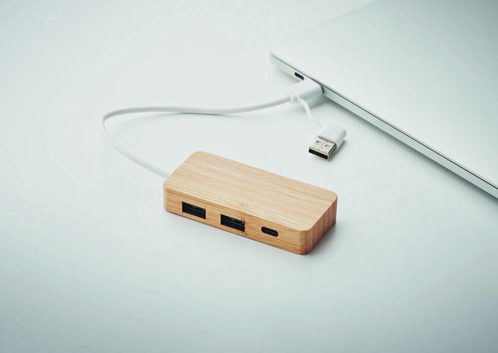 USB hubil on 3 porti (2 Type-A ja 1 Type-C) bambusest korpuses ning 20 cm pikkune kaabel.