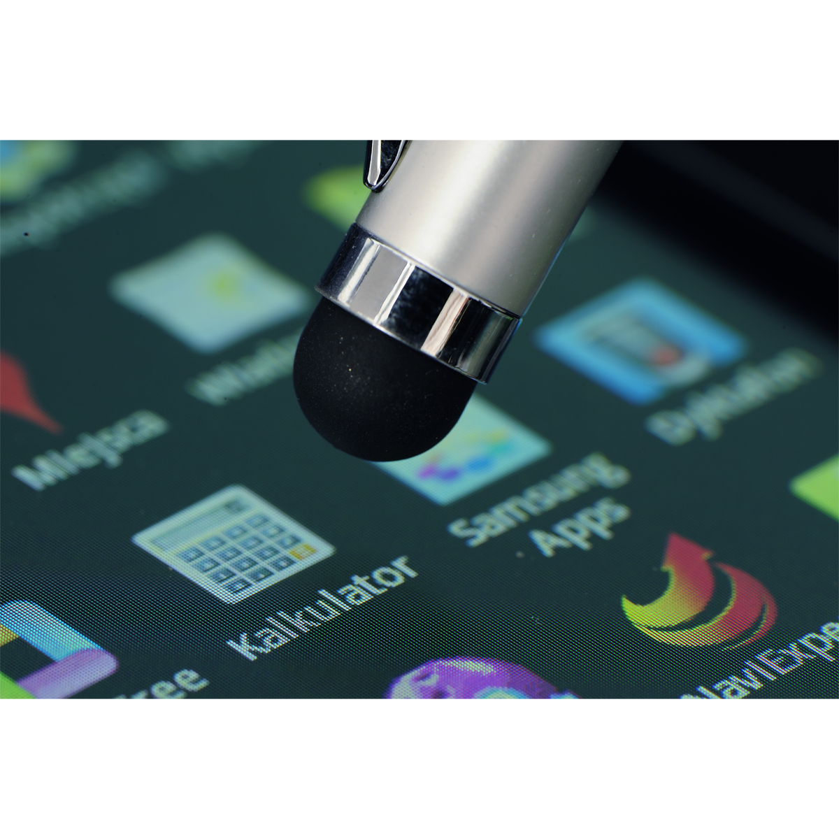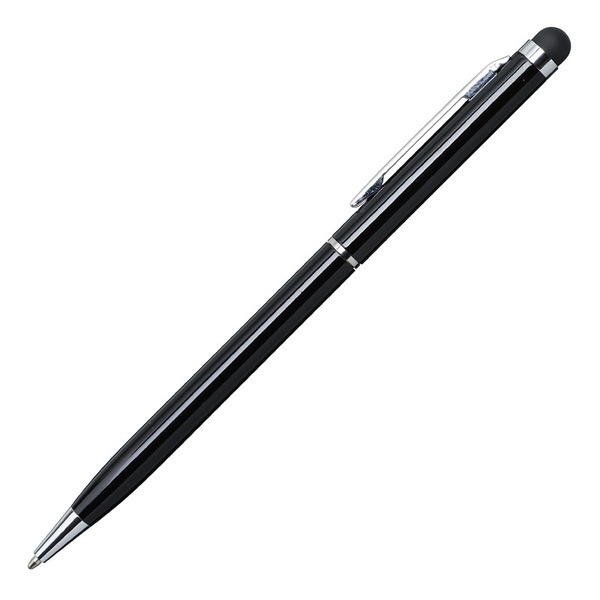 The stylus pen is made of aluminum and features a tip designed for touchscreen devices. It includes a twist-action ballpoint pen with blue ink, combining functionality and style.