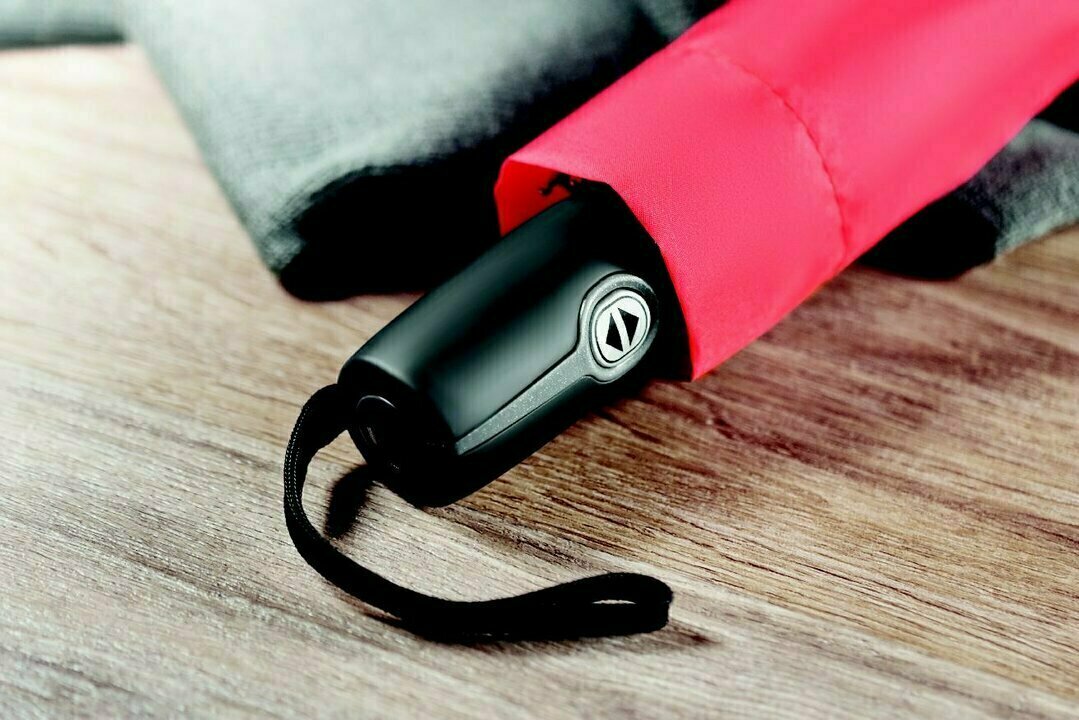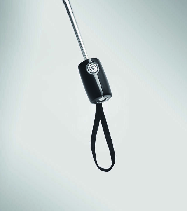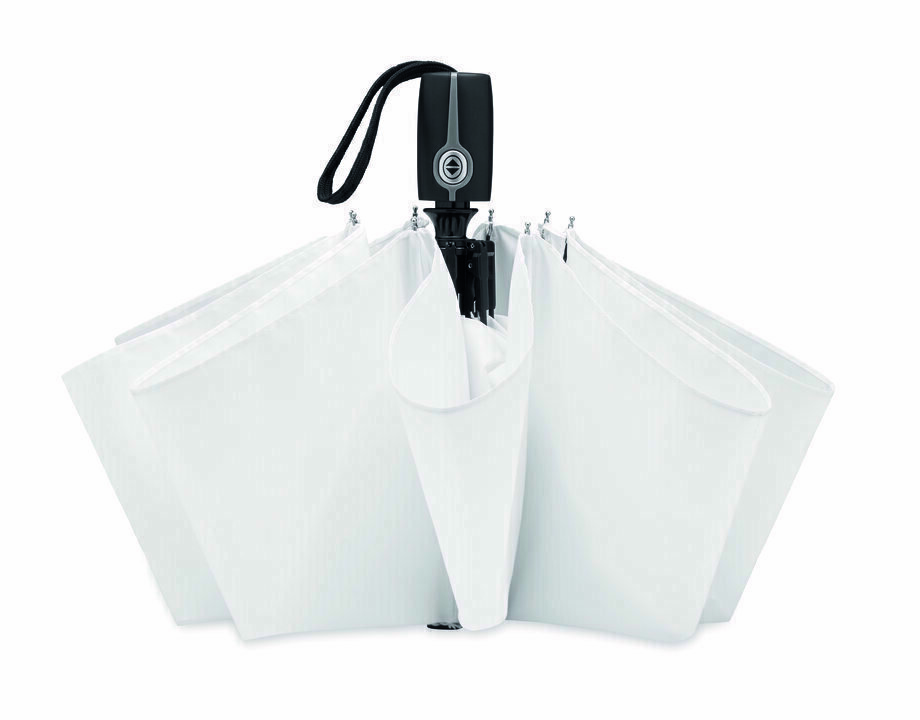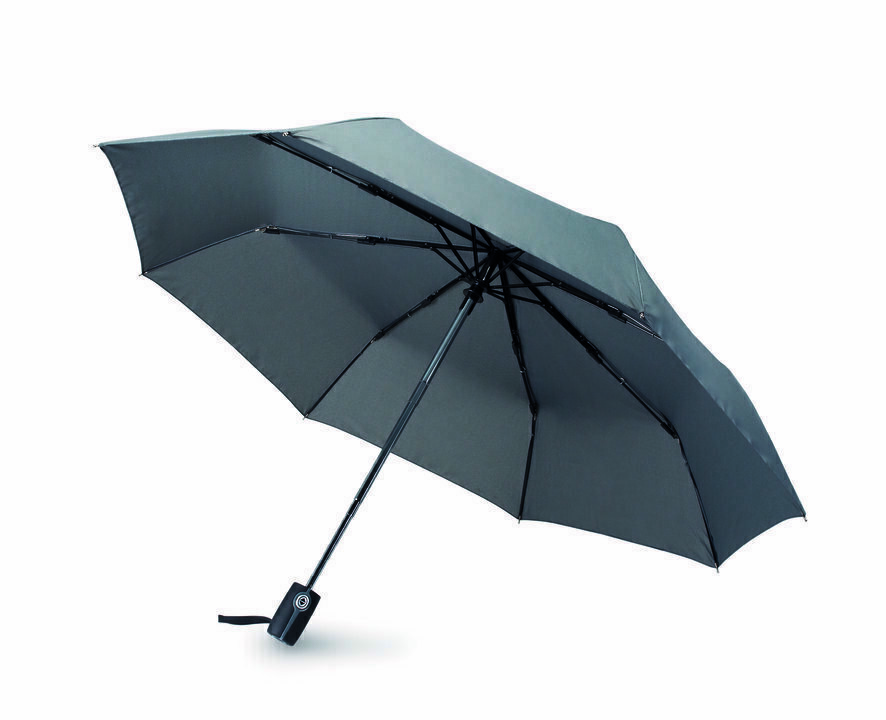 Folding windproof umbrella, made of polyester and with a zinc-plated stainless steel shaft. The umbrella handle is rubberized and the product comes with a suitable cover to put the umbrella into after use. Automatic opening and closing.