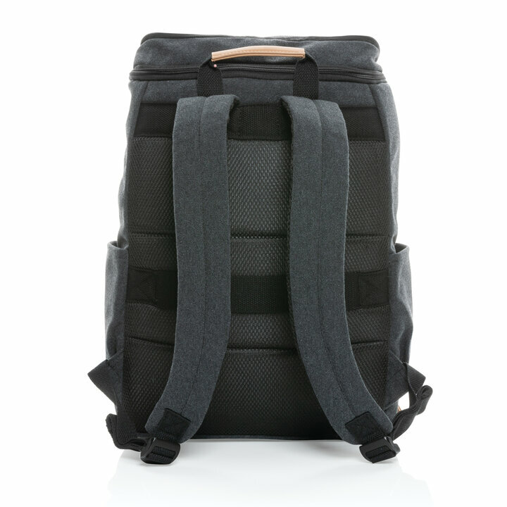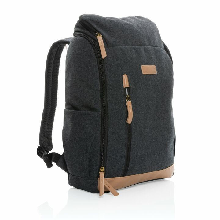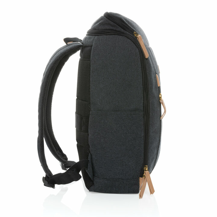 A laptop backpack made from recycled materials. It features an easily accessible deep vertical front pocket with a zipper, a spacious interior, and a 15-inch laptop compartment. The backpack is composed of 60% recycled cotton and 40% recycled polyester, with a lining made from recycled polyester (150D).