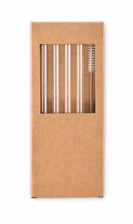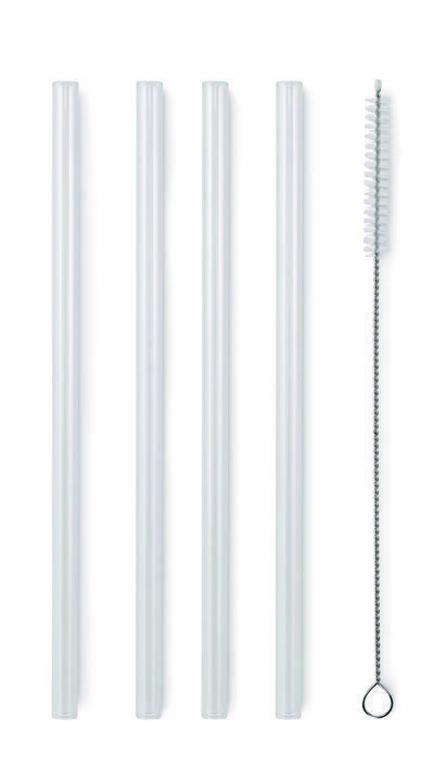 Joogikõrte komplekt 4 tk sisaldab nelja korduvkasutatavat boorsilikaatklaasist kõrre ja puhastusharja.