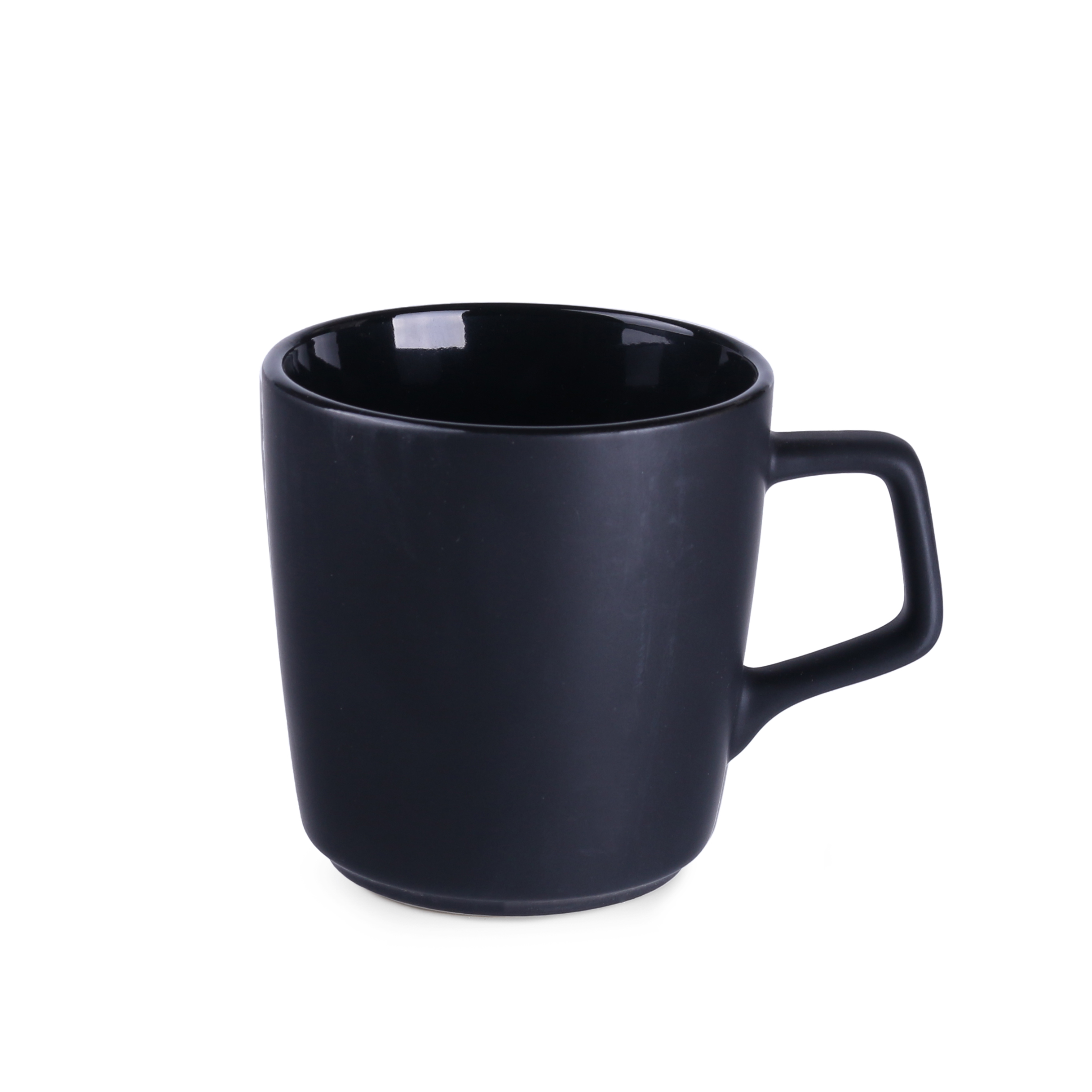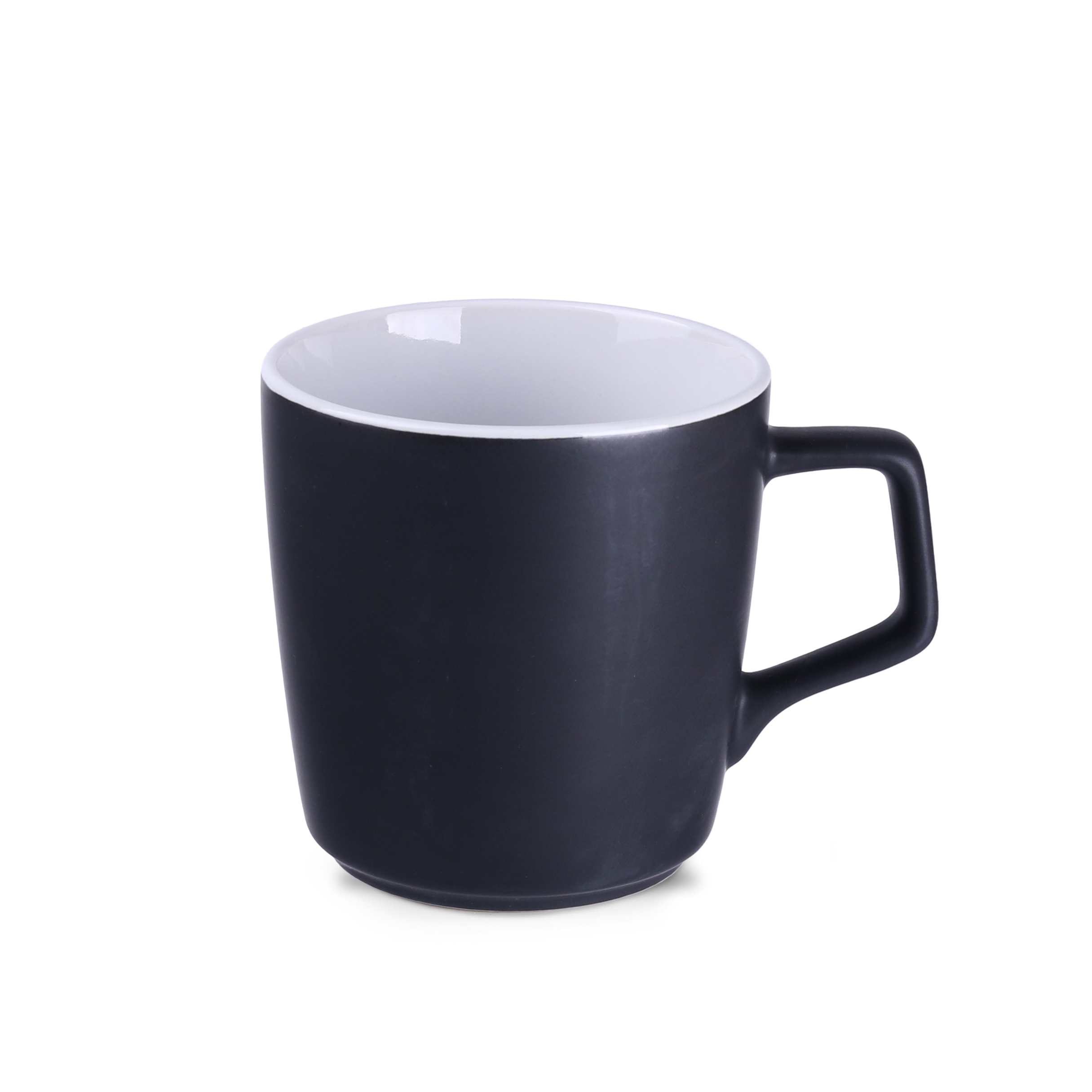 Keskmise mahutavusega kruus, mille sang on kandilise kujuga, kruusi väliskülg on matt must ja sisu läikiv värviline või valge.