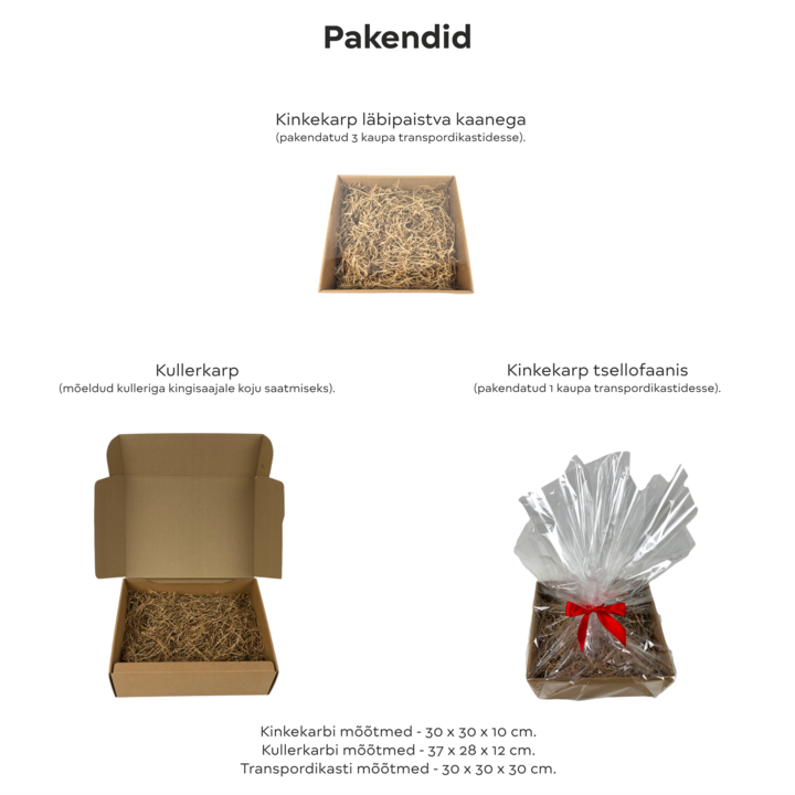 Need kingipakid on personaalselt komplekteeritud vastavalt kliendi soovidele, et luua ainulaadne ja meeldejääv kingitus. Iga pakk on hoolikalt kokku pandud, kasutades looduslikku pruuni paberlaastu täitematerjalina, ning pakendatud kvaliteetsesse ja esinduslikku kinkekarpi. Nende kingipakkide eripära seisneb selles, et need ühendavad meie tava tootevaliku esemeid Eesti väiketootjate erilise ja kvaliteetse toodanguga pakkudes võimalust luua tõeliselt unikaalne kingitus.