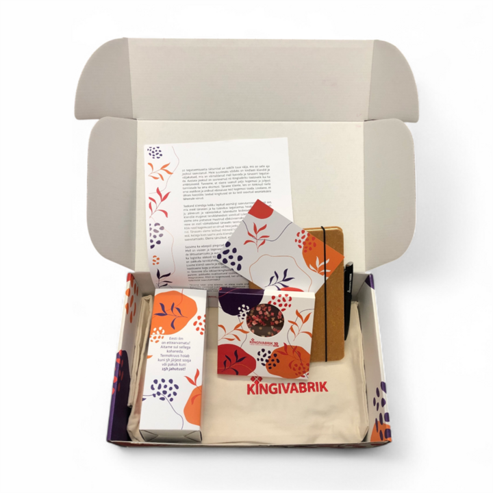 Komplekti kuulub trükitud karp, mida saab kujundada täies ulatuses, ning lisaks A5 või A6 formaadis trükitud kaart ja A4 formaadis personaalne kiri.