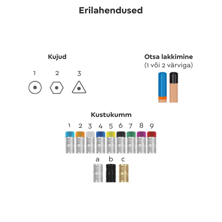 Selle hariliku pliiatsi teeb eriliseks võimalus valida erinevate pliiatsi kujude vahel. Kuna hind ei muutu erinevate kujude puhul, siis palun märkige oma eelistatud kuju kommentaarides. Lisaks on sellel harilikul pliiatsil mitmeid väga suure trükialaga personaliseerimise võimalusi. Pliiatsi tina on HB ning toode on kliimaneutraalne.