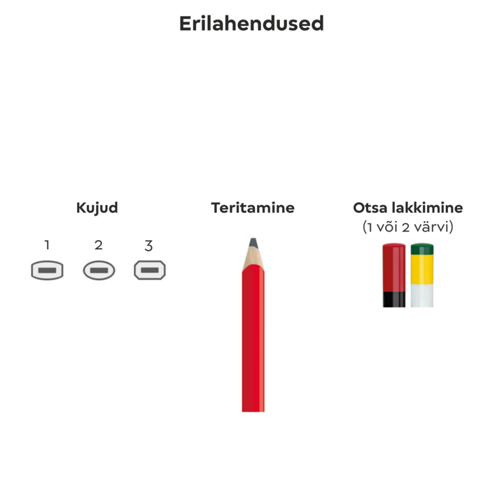 Selle ehituspliiatsi teeb eriliseks võimalus valida erinevate kujude vahel. Kuna hind ei muutu erinevate kujude puhul, siis palun märkige oma eelistatud kuju kommentaarides. Lisaks on sellel ehituspliiatsil mitmeid väga suure trükialaga personaliseerimise võimalusi. Pliiatsi tina on HB ning toode on kliimaneutraalne ja TÜV-testitud.