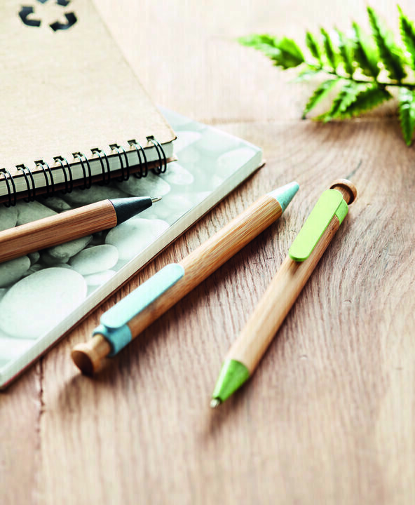 Bambusest ümbrisega pastapliiats, millel on keskkonnasõbralike nisuõlgede ja plastiku segust detailid. Pastapliiatsil on sinine tint.