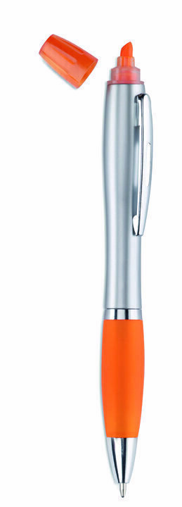 Hõbedase satiinviimistluse ja kroomitud detailidega pastapliiats, mille ühes otsas on marker. Pastapliiatsil on sinine tint.