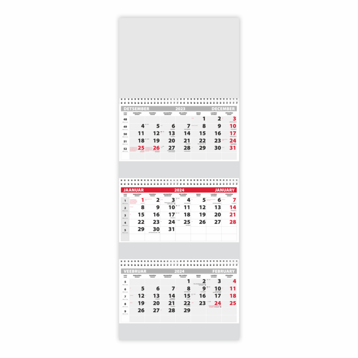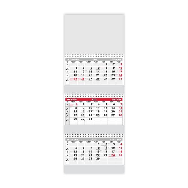 Seinakalender TRIO EXTRA on kolme nähtava kuuga spiraalköites kalender. Spiraalköide on ka iga kuu vahel, mis võimaldab kalendrit hõlpsasti kokku voltida. Kalendaariumi küljes on punast värvi kuupäevamärkija. Kalendri ülaosas on A4 suuruses trükiala reklaampildi jaoks ning iga kalendaariumi allääres 6 cm kõrgune riba reklaamtekstide jaoks.