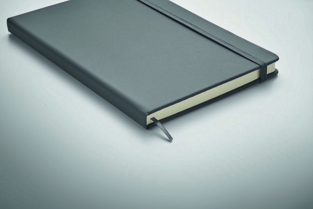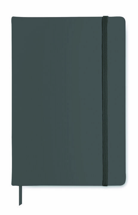 Kõvade kunstnahast kaantega A5 märkmik, millel on 96 valget lehte, järjehoidjapael ning märkmik on suletav elastse kummigapaelaga.