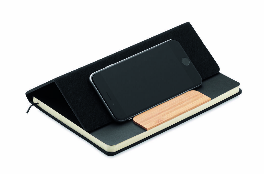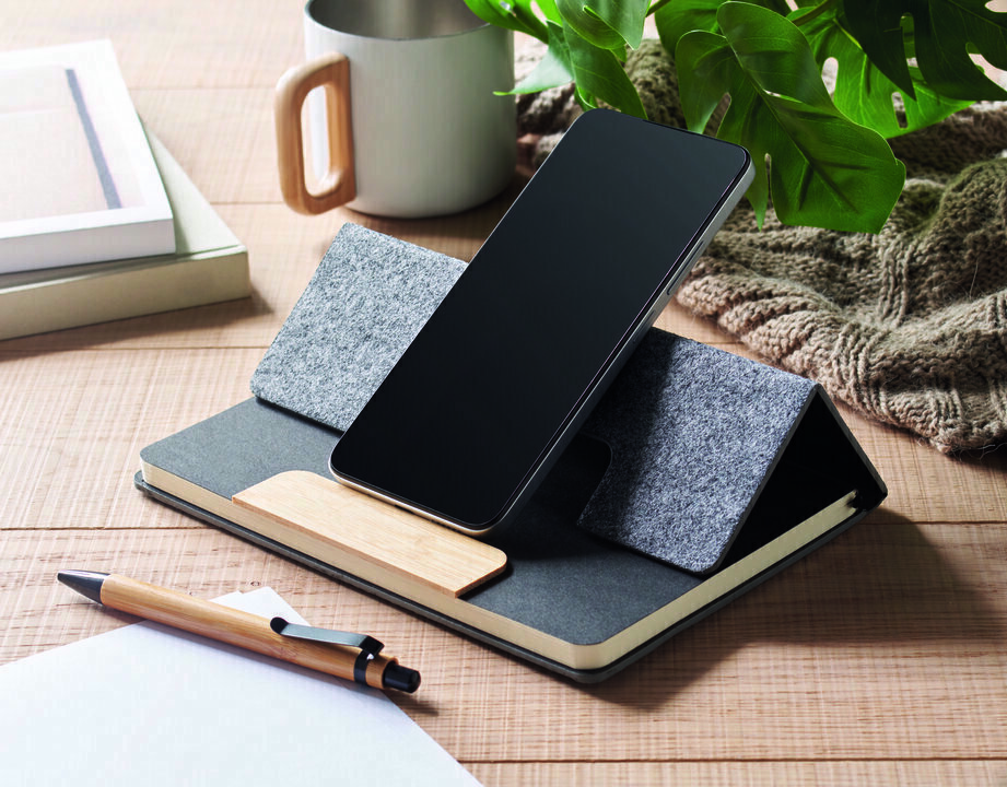 Märkmik A5 on RPET-vildist kaanega, telefonialusega ja bambuspastakaga. Sisaldab 160 lehekülge.