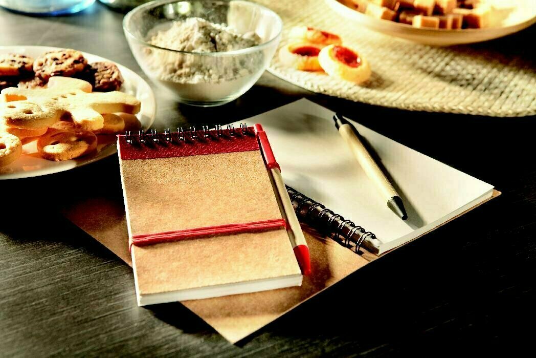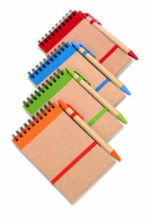 Taaskasutatud paberist märkmik koos pastapliiatsiga. Märkmikul on 70 lehte ja elastne pliiatsihoidja. Pastapliiats on valmistatud taaskasutatud kartongist ja biolagunevast plastikust ning sellel on sinine tint.