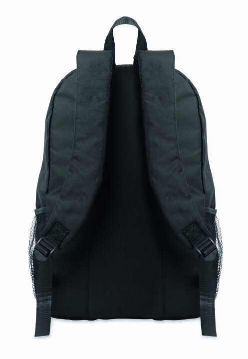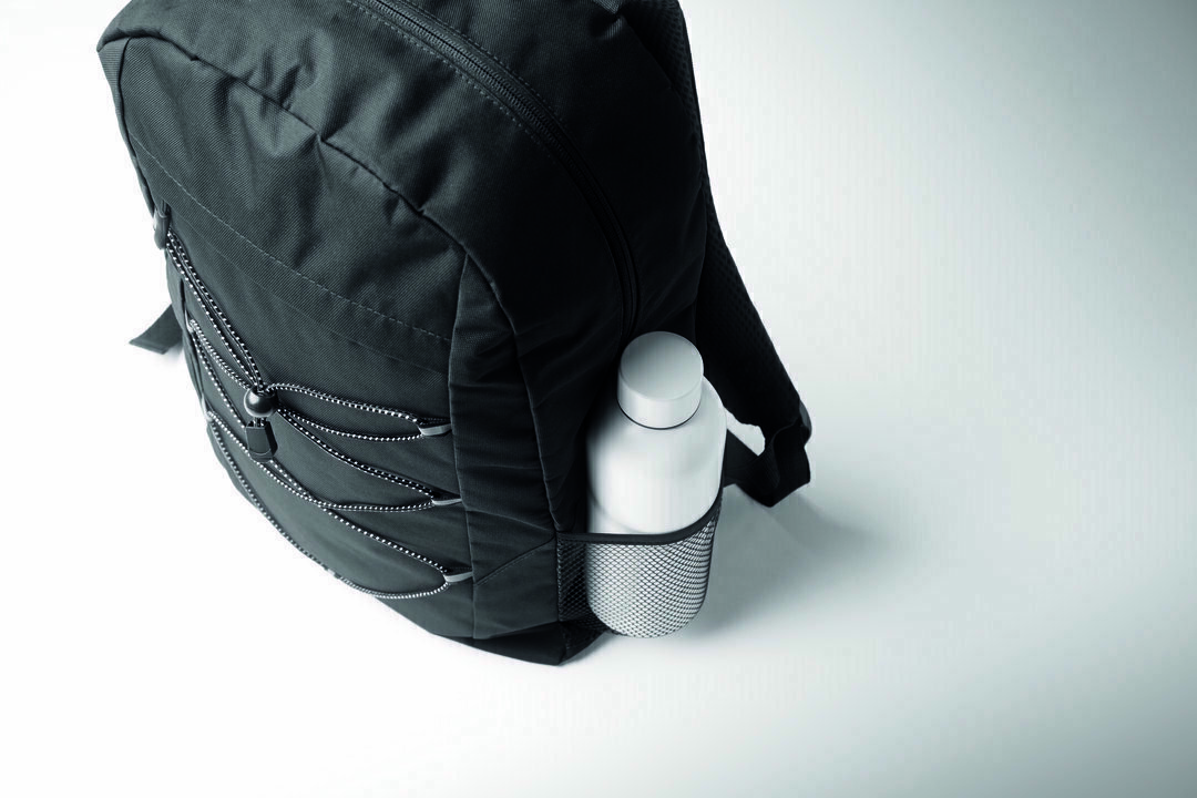 See seljakott on valmistatud ümbertöödeldud polüestrist ning sellel on esiküljel dekoratiivne pael ja lukuga tasku. Mõlemal küljel on lisaks võrktaskud.
