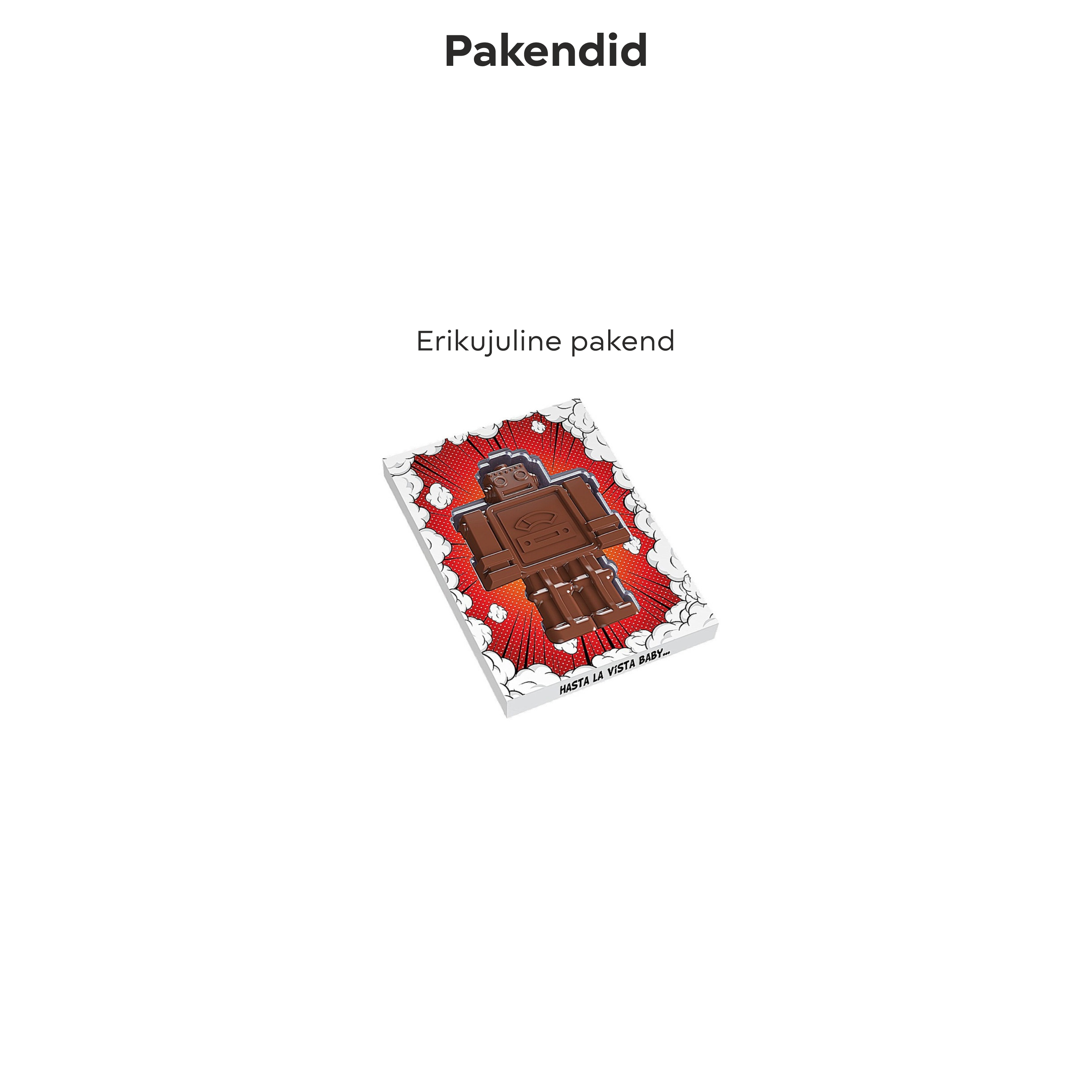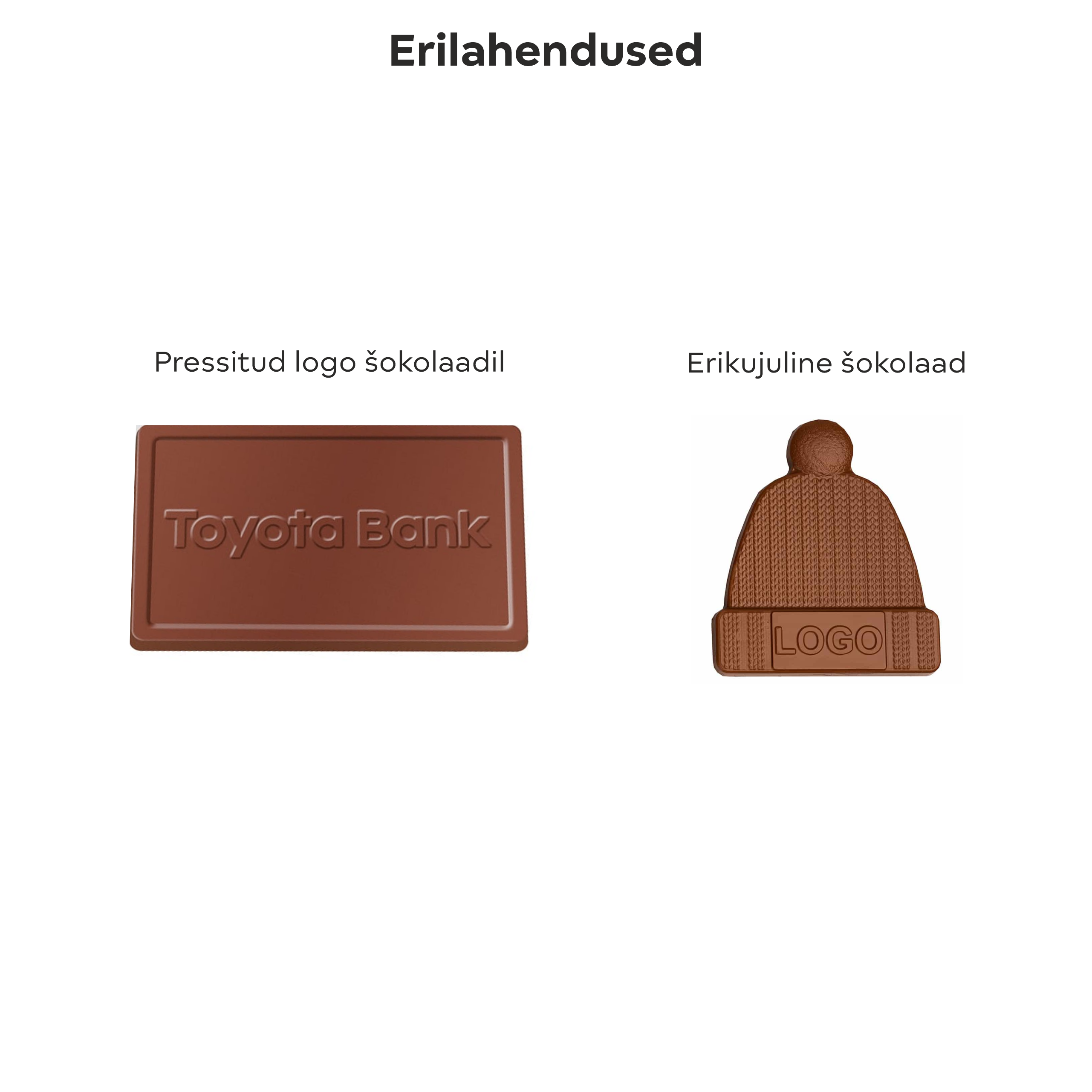 Väga maitsev šokolaad, mille eripäraks on lai erinevate kujude valik. Pakendile trükime Teie soovitud kujunduse.