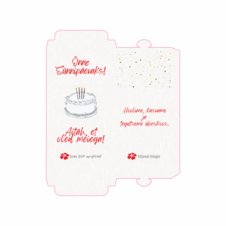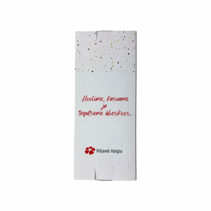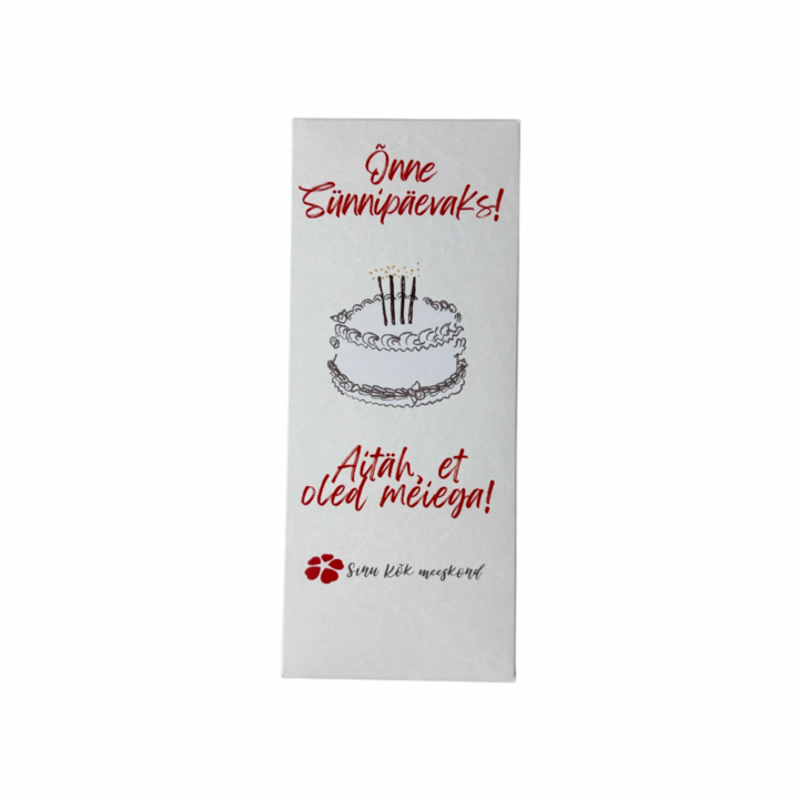 Šokolaadiümbris, mis on trükitud vastavalt teie soovitud kujundusele. Ümbrisesse pakendame 100g Kalev Nurr šokolaadi. Soovi korral on võimalik sokolaad asendada mõne muu valitud šokolaadiga, mille šokolaaditahvli mõõtmed ei ületa 15.5 x 7.5 x 1 cm. Lisaks on võimalik tellida erimõõtmetes šokolaadiümbriseid, mis sobivad teie valitud šokolaaditahvlile. Selle jaoks palume saata päring e-posti teel.