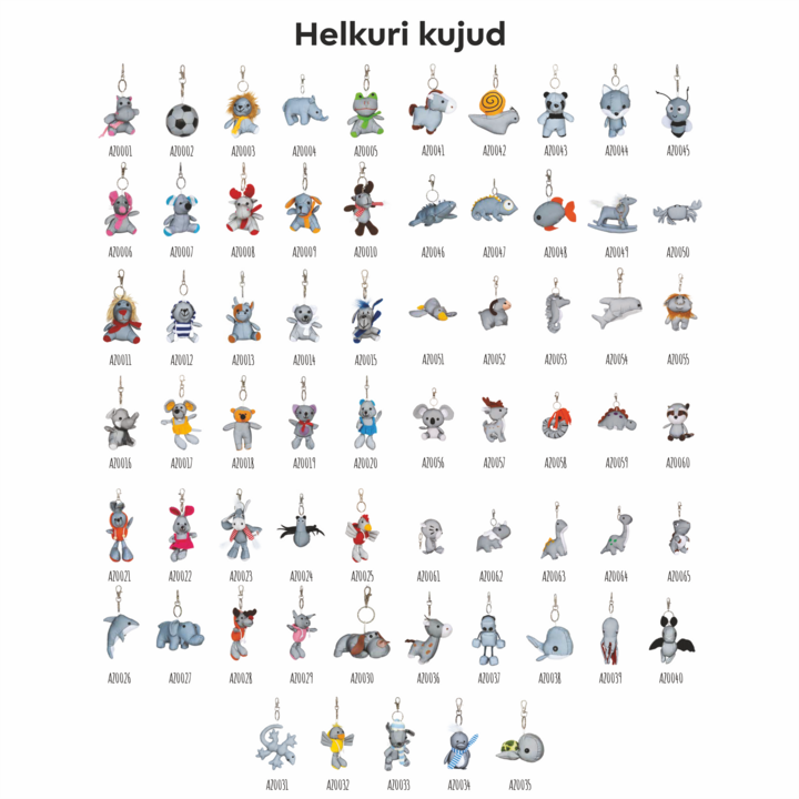 Helkurkangast loomakujuline võtmehoidja. Erinevate valikutega saate tutvuda piltidel. Toode on valmistatud sertifitseeritud helkurkangast ning selle kinnituseks on parrot hook. Helkur vastab Euroopa Liidu kvaliteedistandardile EN 13356:2001 ning sisaldab kasutusjuhendit.