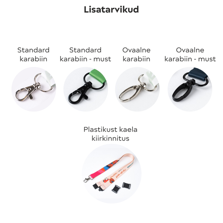 Ümbertöödeldud polüestrist kaelapael on toode, mida valmistame täielikult teie soovide järgi. Kohandamisvõimalused on järgmised: kaelapaela laius (‘vali suurus’ rippmenüü); trükkimine kas ühele küljele (vaikimisi) või mõlemale küljele (sellisel juhul valige ‘vali lisa trükivõimalus’ rippmenüüst). Pärast trükkimist õmmeldakse kaelapael kokku ning lisatakse soovitud kinnitus. Kinnitused saab valida ‘vali lisatarvik’ rippmenüüst ja valikuid saab näha piltidelt – vaikimisi on kasutusel ‘standard karabiin’. 2 karabiiniga kaelapaela kasutatatakse juhul, kui kaelakaardil või kaelakaardi taskul on 2 kinnitusauku.