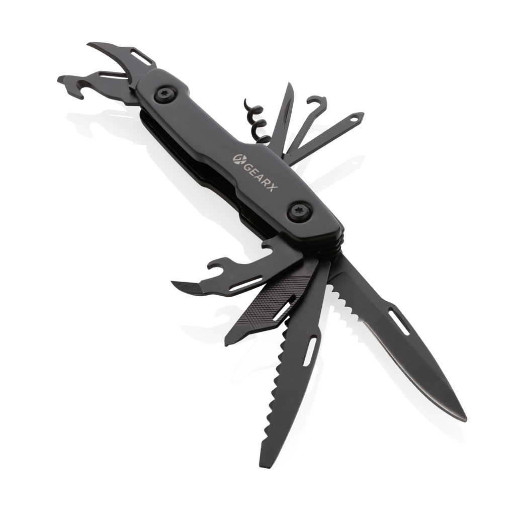 Gearx multifunktsionaalne tööriist – kõik vajalik ühes taskusuuruses tööriistas. Luksuslik alumiiniumkorpus on ühendatud esmaklassiliste musta värvi roostevabast terasest (420) tööriistadega. 13 funktsiooni hulka kuuluvad: nuga, saag, lapik kruvikeeraja, konserviavaja, viil, väike ristpeaga kruvikeeraja, ristpeaga kruvikeeraja, korgitser, väike nuga, nahastants, pakendiavamisnuga ja pudeliavaja. See tööriist on alati kasutamiseks valmis. Pakitud luksuslikku kinkekarpi, ideaalne kingituseks.