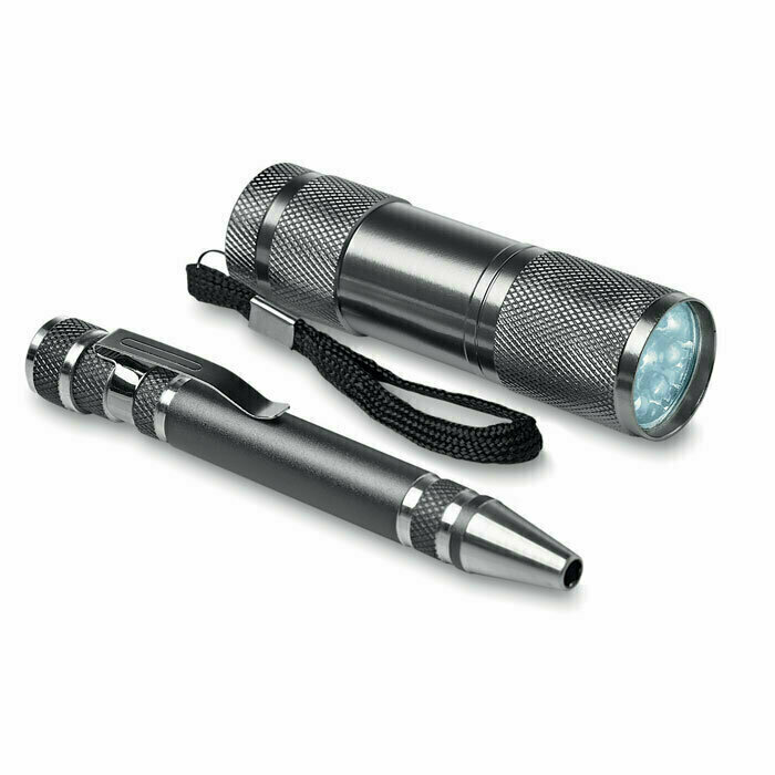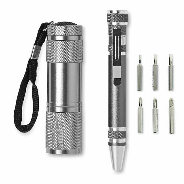 2-osaline tööriistakomplekt. Komplekti kuuluvad LED-taskulamp ning pliiatsikujuline vahetatavate rist- ja lamepea otsikutega kruvikeeraja. Taskulamp töötab 3 x AAA patareiga, patareid ei kuulu komplekti.