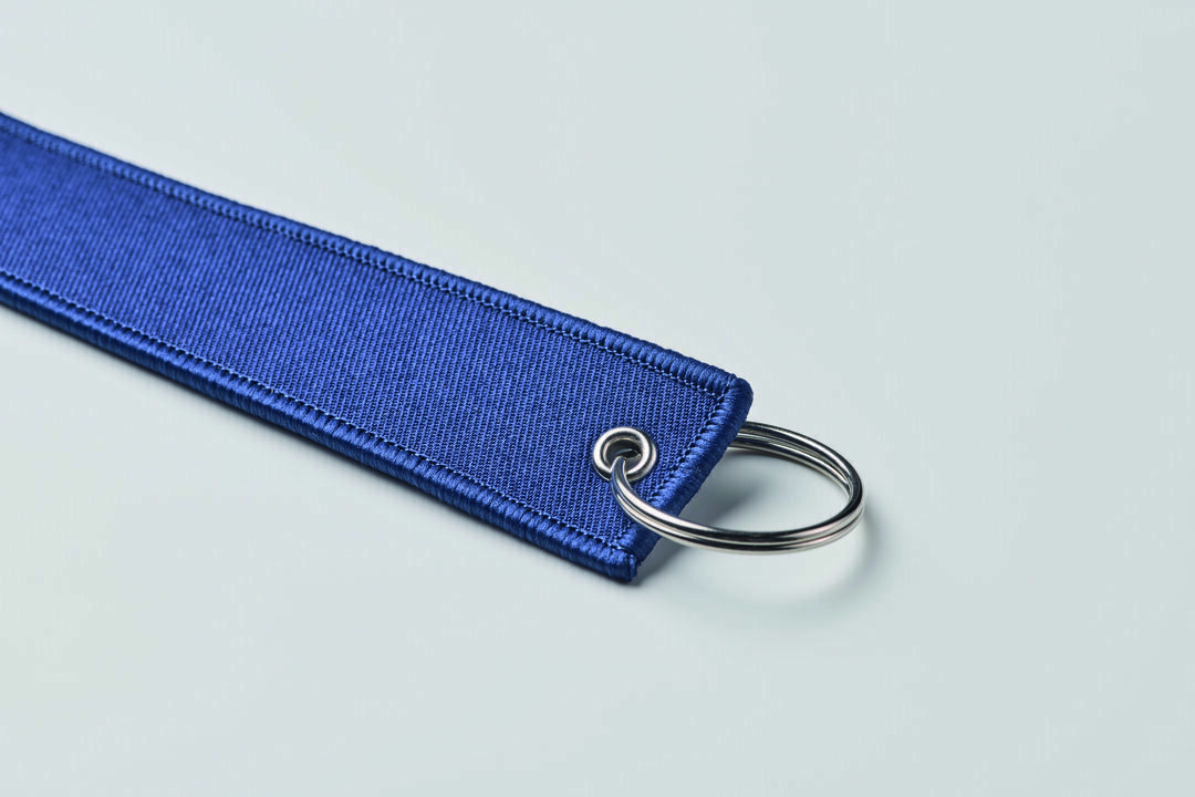 Võtmehoidja on polüestrist rihmaga ja tekstiga ‘Remove Before Flight’.